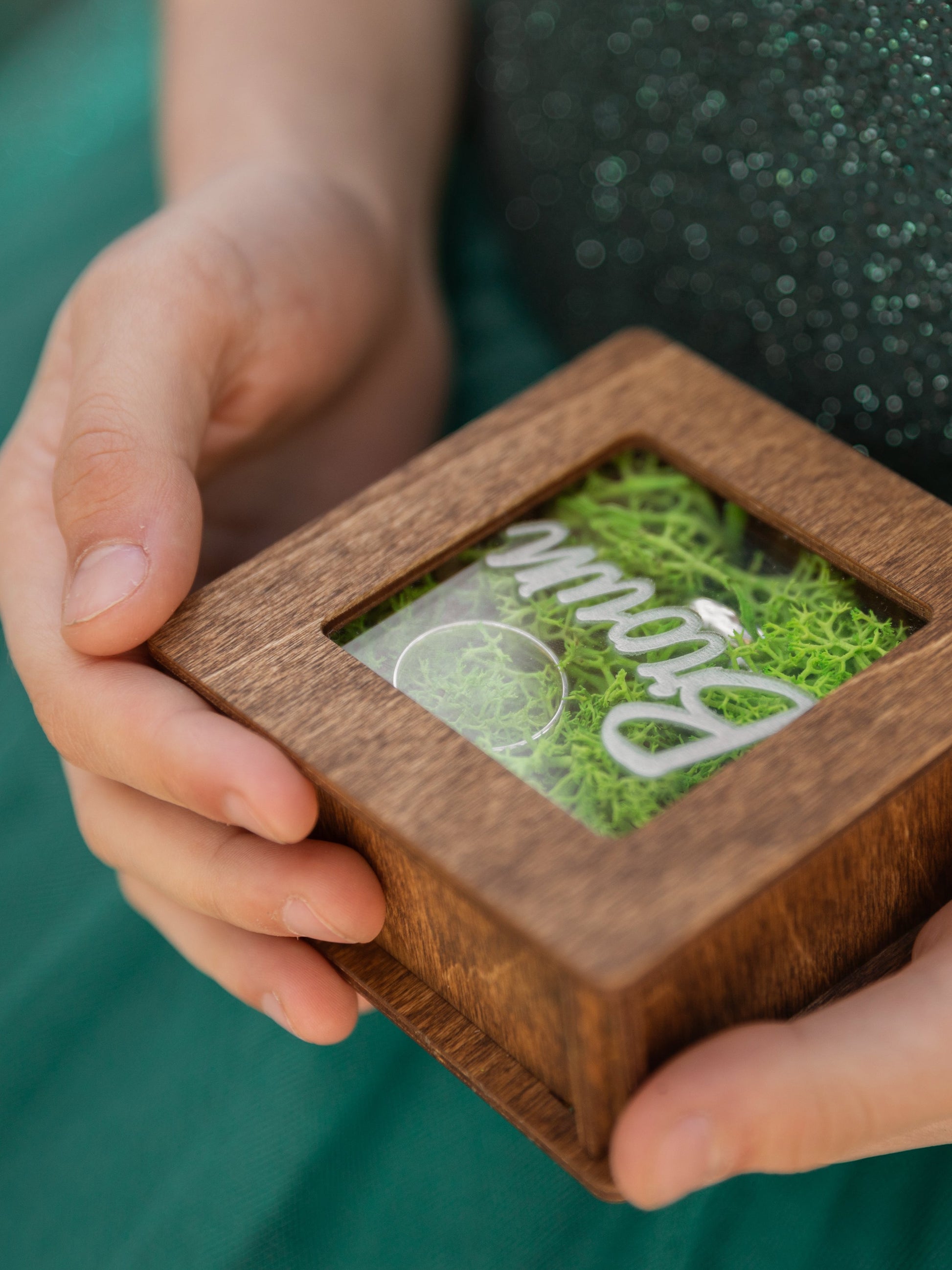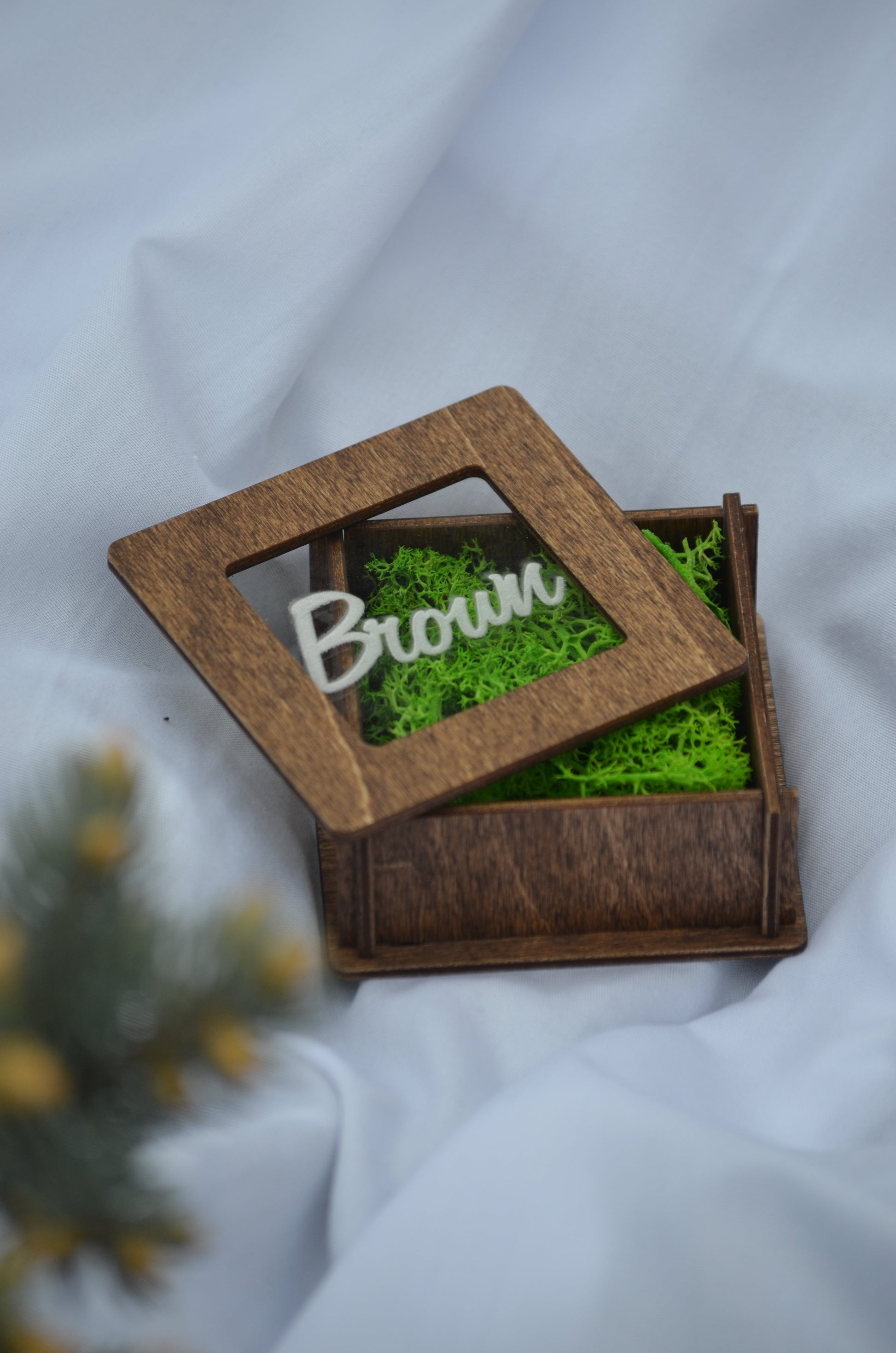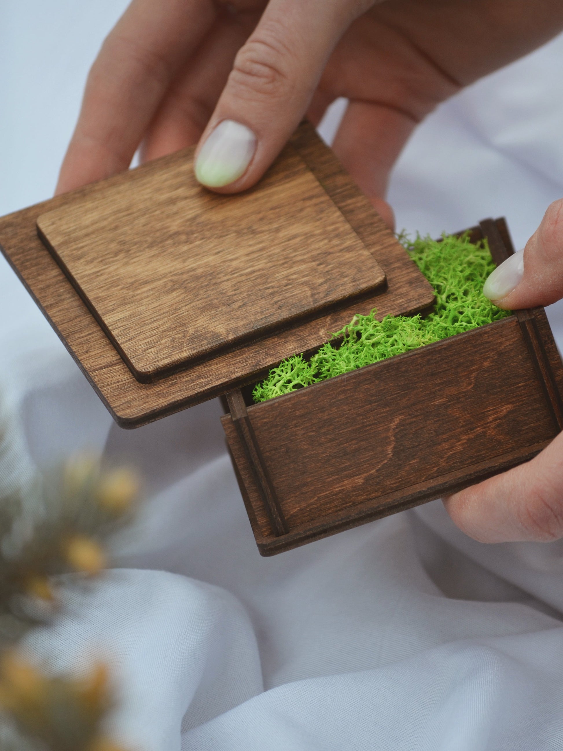 The ring box comes with moss filling. The filling can be taken out and you can fill the box with any material.