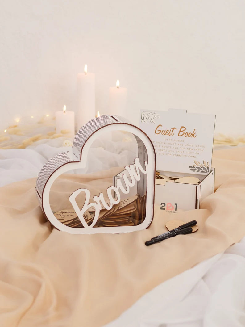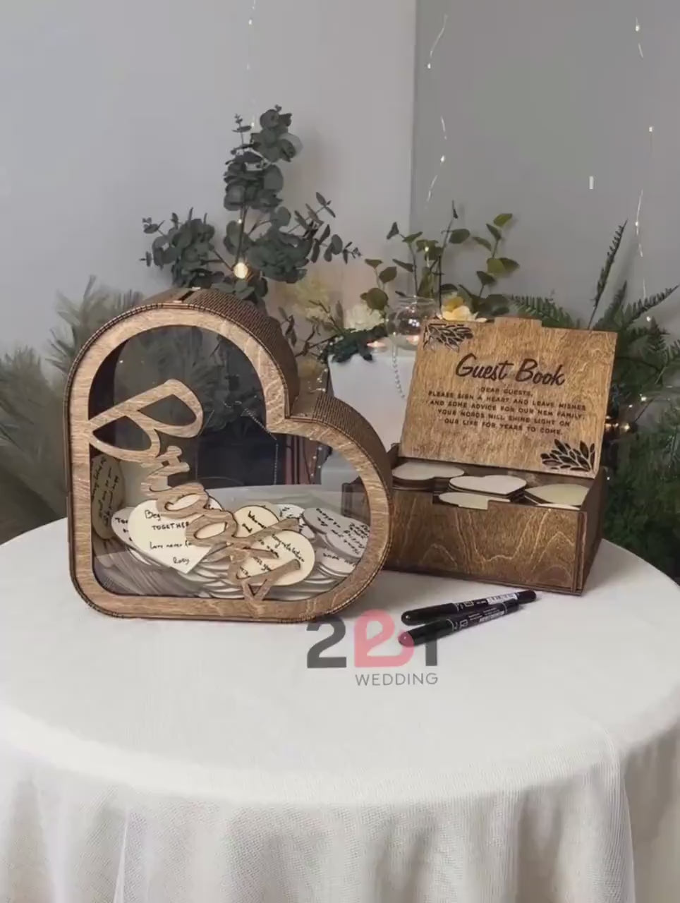 Surprise your guests our Wedding Guest Book Alternative! This gorgeous heart-shaped box can house every wish and blessing that your guests bestow upon your union. All they have to do is write everything down on small wooden hearts, sign their wishes, and drop the heart inside the box.