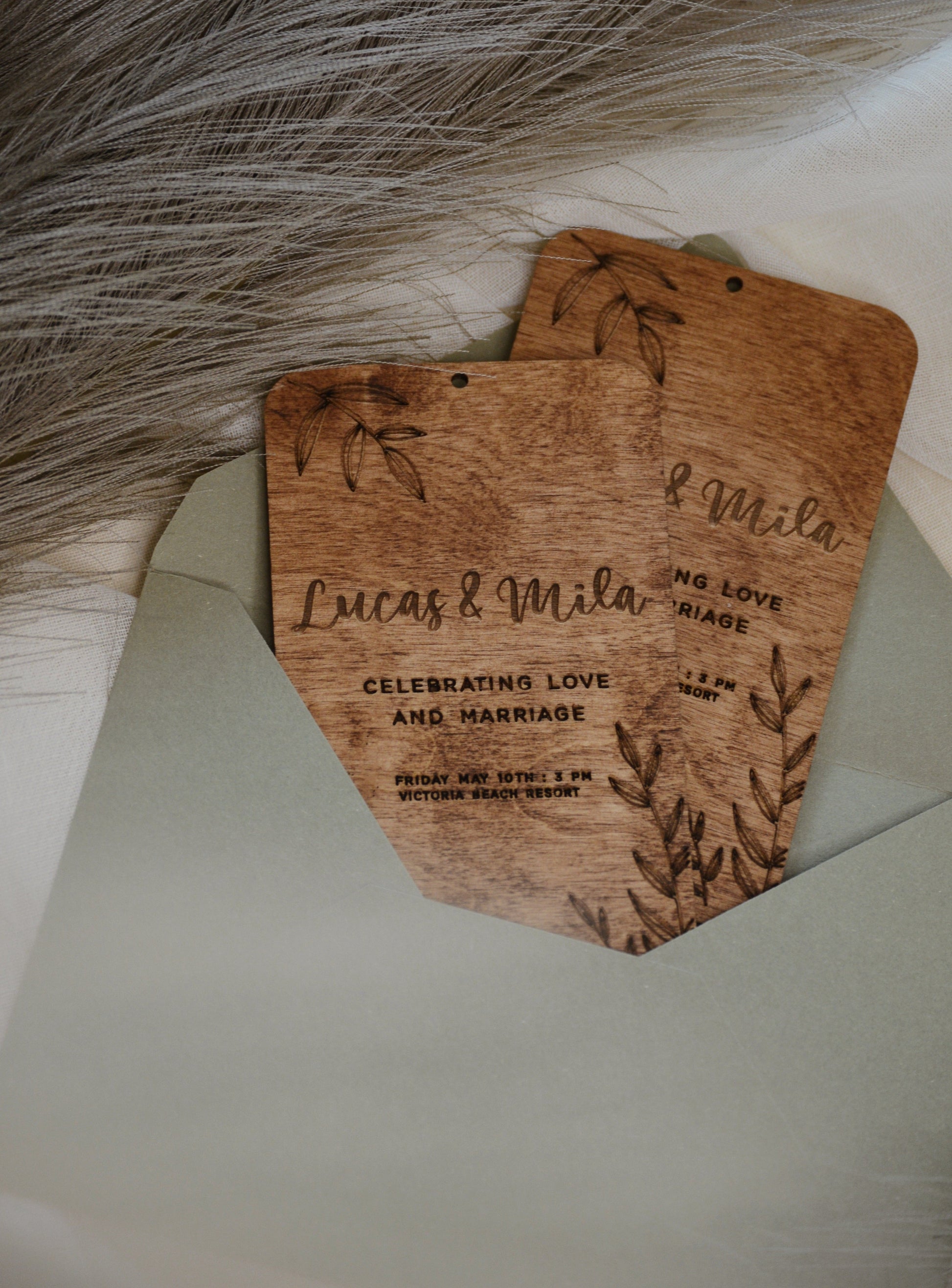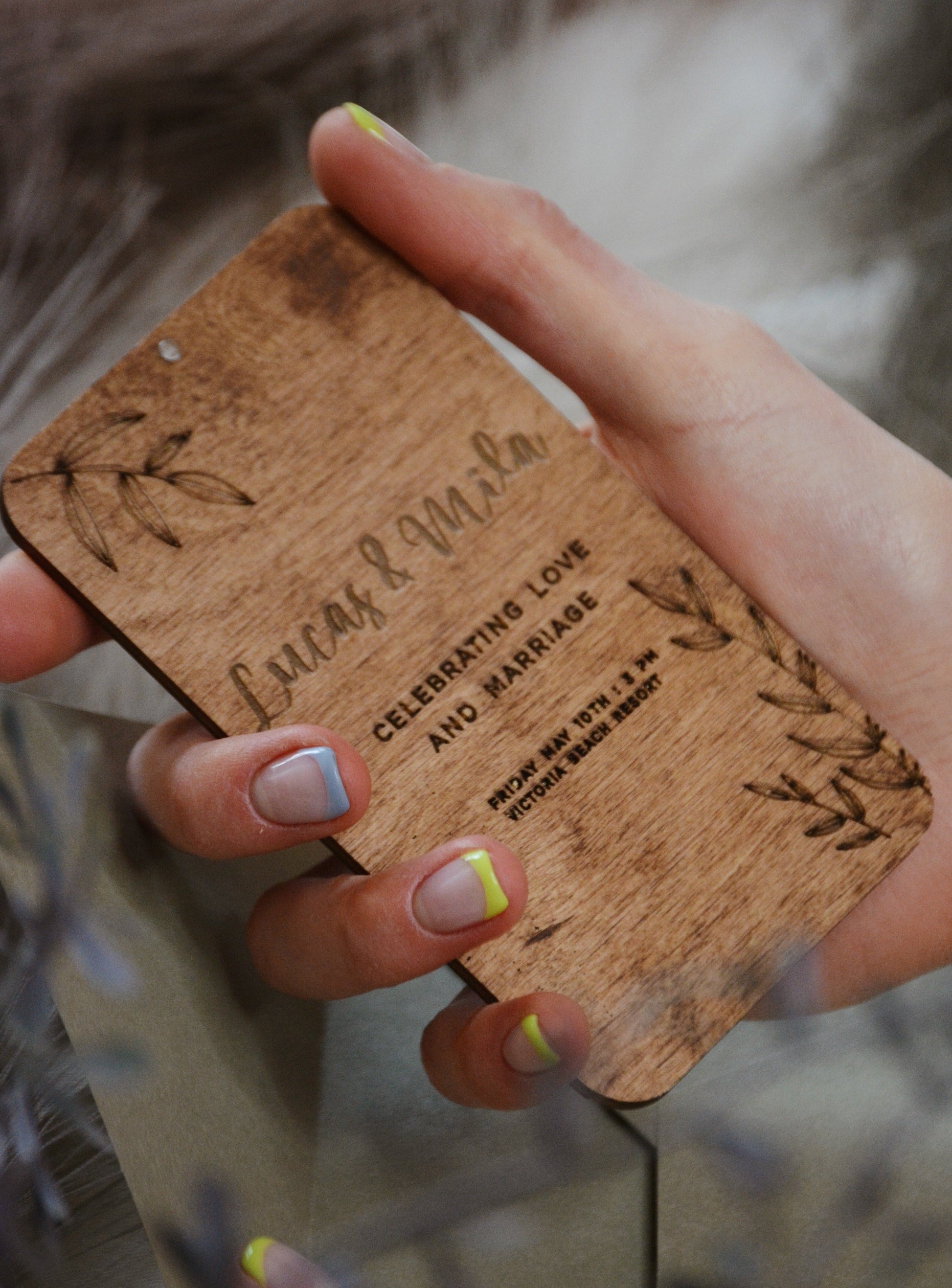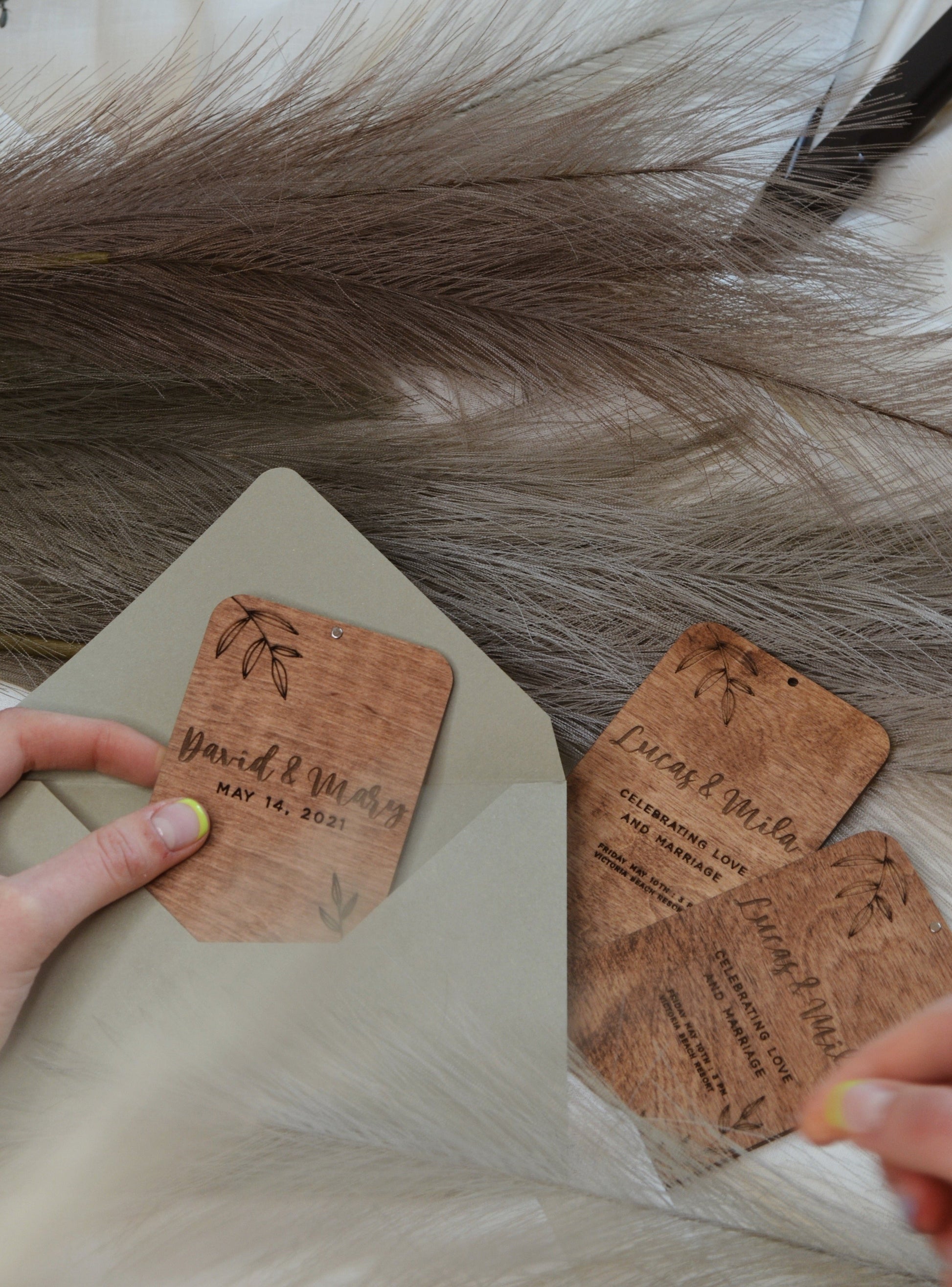 Every invitation is handmade with great care by our craftsmen from high-quality plywood with engraving techniques so they are indelible.