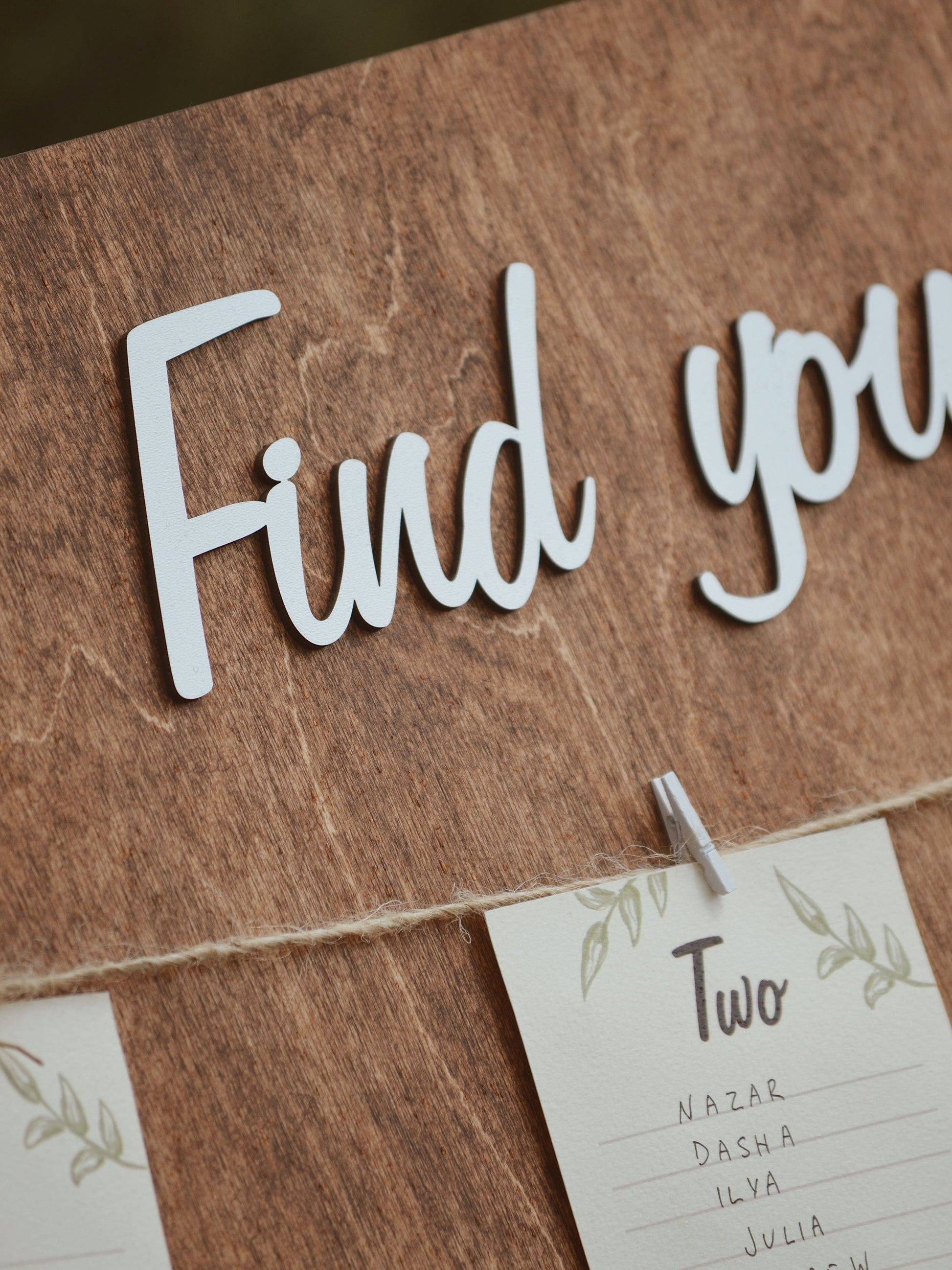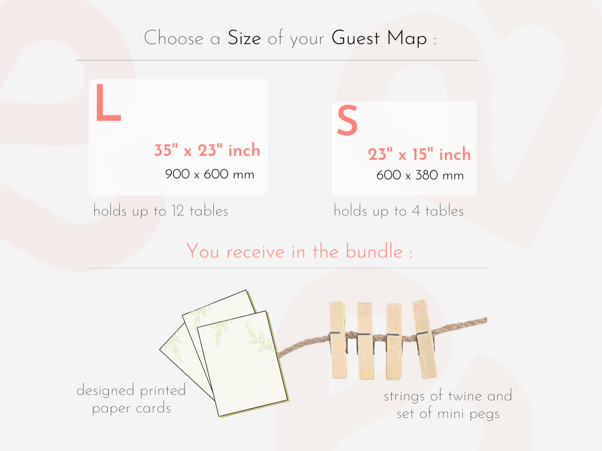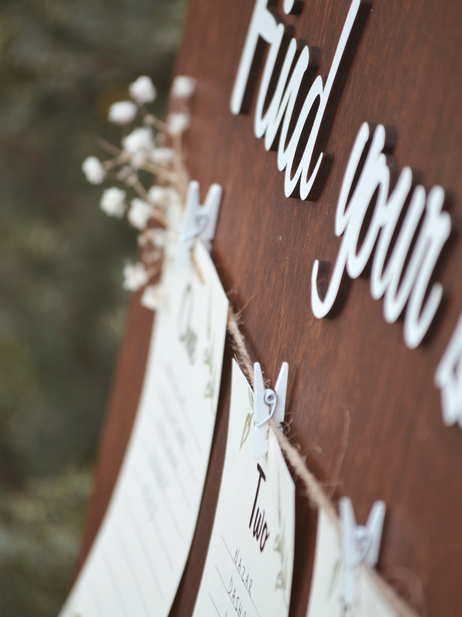 When you purchase our Seating sign, you will receive as a gift from us: 2 strings of twine, a set of mini pegs, and designed printed number cards for each table in the bundle.
